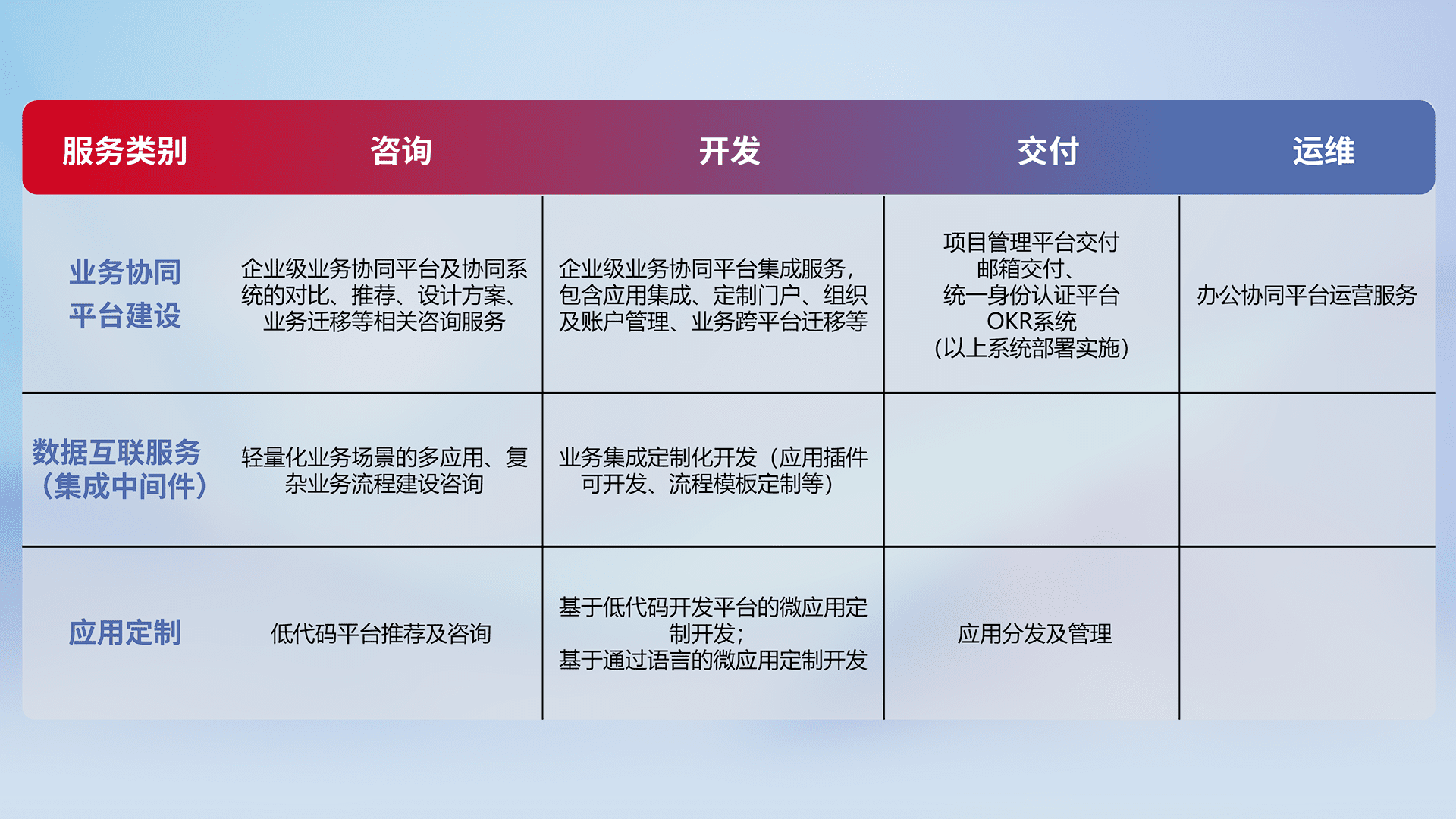 针对钉钉、、、、企微、、IDaas等平台级产品提供产品的规划、、、、方案、、、、交付、、、定制化开发等服务,,,,实现如统一协同办公、、、、智能客户服务、、、混合会议管理、、、智能数据查询、、等业务场景,,,实现数字化转型。。。。